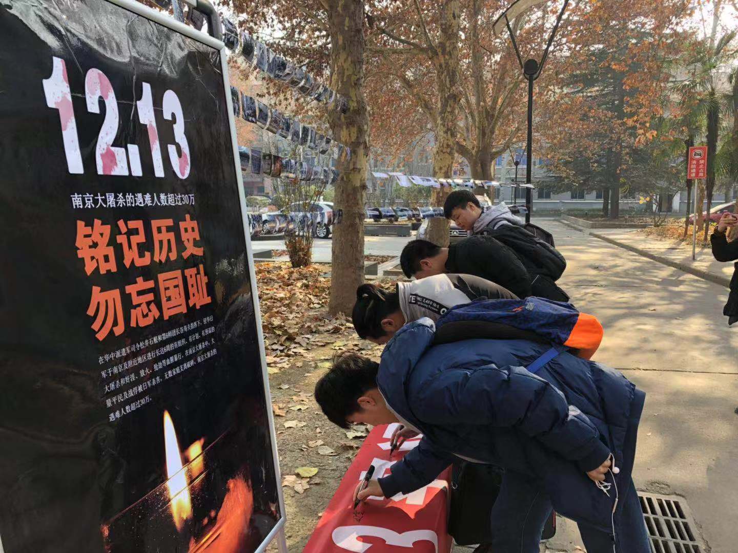 2018年12月13日是第五个南京大屠杀死难者国家公祭日。为教育员工牢记历史、勿忘国耻,凝聚力量、奋力拼搏,TapTap艺术与传媒公司于2018年12月13日13:00在金花校区喷泉广场举办“12.13牢记历史,勿忘国耻,振兴中华”图片展和签名活动。