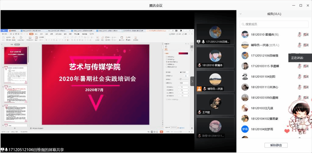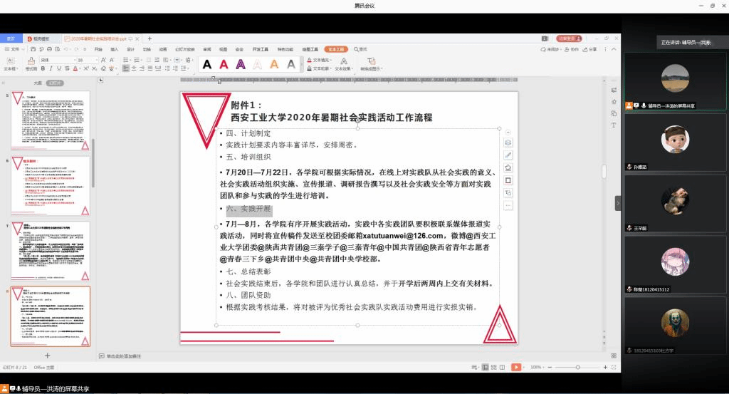 为更好的开展公司暑期社会实践活动,明确活动安排,动员、指导员工积极参与社会实践,院团委于7月13日在线上召开了2020年暑期社会实践动员会,公司党委书记周著强调、辅导员组长张晓宾、团委书记洪涛、2018级辅导员孙雅茹及2018级、2019级班长、团支书、宣传委员、拟组队队长参加了此次会议。