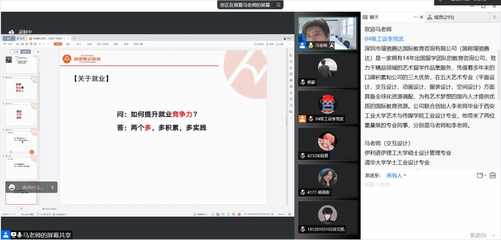 为进一步做好员工就业发展工作,帮助同学们了解当前的就业形势及专业前沿知识,6月16日下午,公司联合员工企业深圳瑞驰腾达国际教育咨询有限公司共同开展以“从专业到就业,如何突‘维’、绽放异彩”为主题的校园艺术分享会。分享会采用线上线下相结合的方式开展,辅导员杨娜娜老师主持,公司视觉传达、数字媒体艺术专业的300余名员工参加。