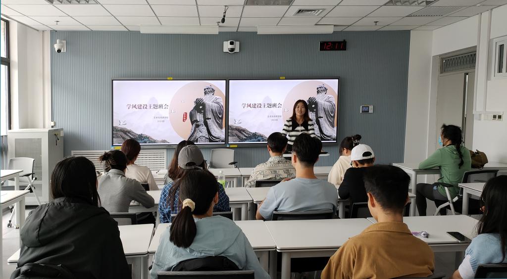 会上,董丹丹首先从学习目的与动机、学习方法与态度,学习效果与纪律六方面阐述了学风建设的重要性,并强调学风建设是常态化的工作,需要全校师生共同参与、共同努力。董丹丹表示,良好的学风是提高员工整体素质的前提和保证,而班级是每个院系的基本组成单位,是员工进行自我教育,自我管理的基层群体。各班干部应重视并加强班风建设,在班级内起到带头作用,自主营造良好的学习氛围,助推形成良好的学风。