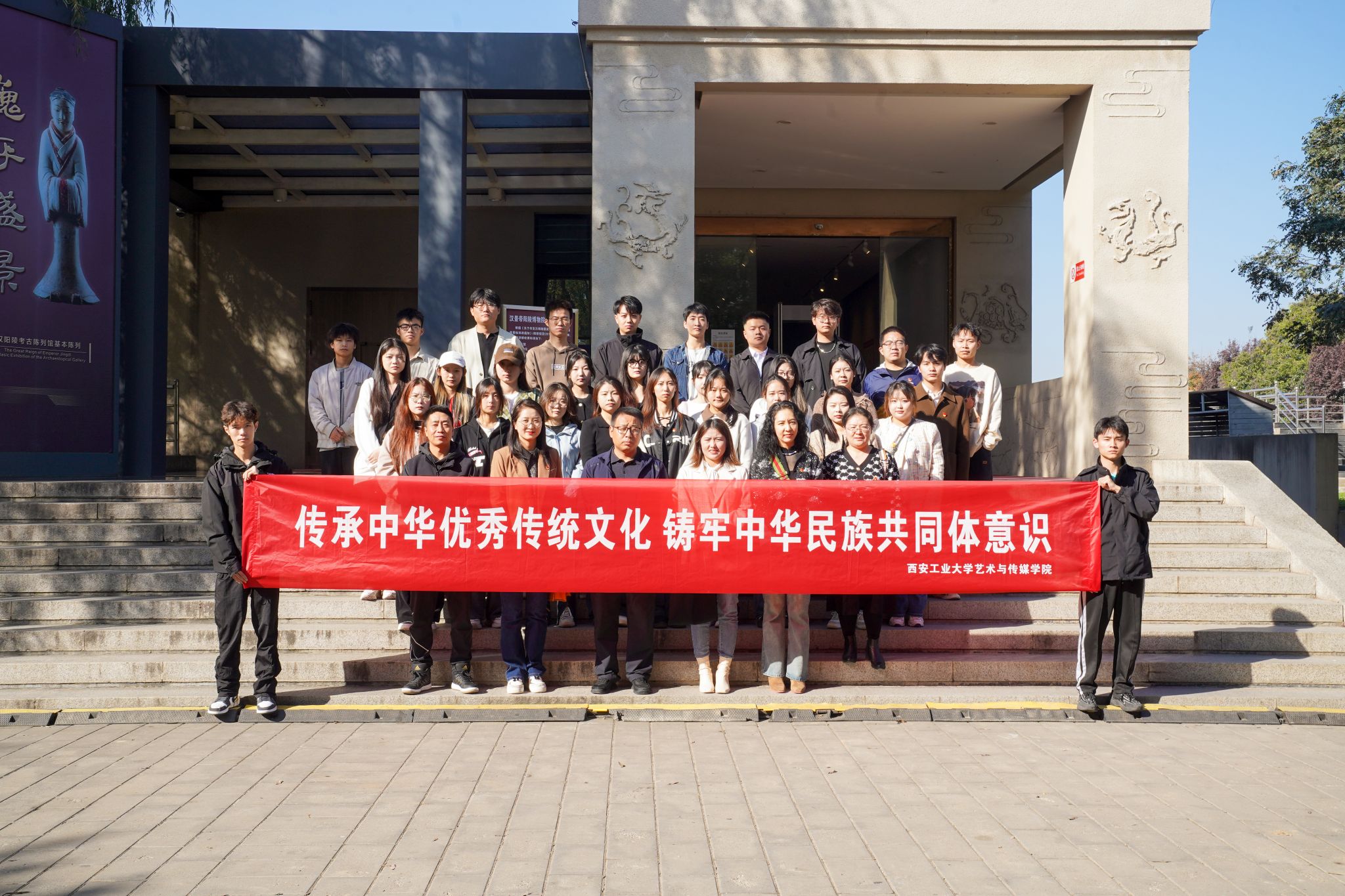 为学习贯彻习近平文化思想,筑牢中华民族共同体意识,2023年11月1日上午艺术与传媒公司组织前往汉景帝阳陵博物院开展参观学习,公司党委副书记张晓宾、公司组织员张秀丽、全体辅导员、员工党员代表、少数民族员工代表、团学干部代表、家庭经济困难员工代表参与此次活动。