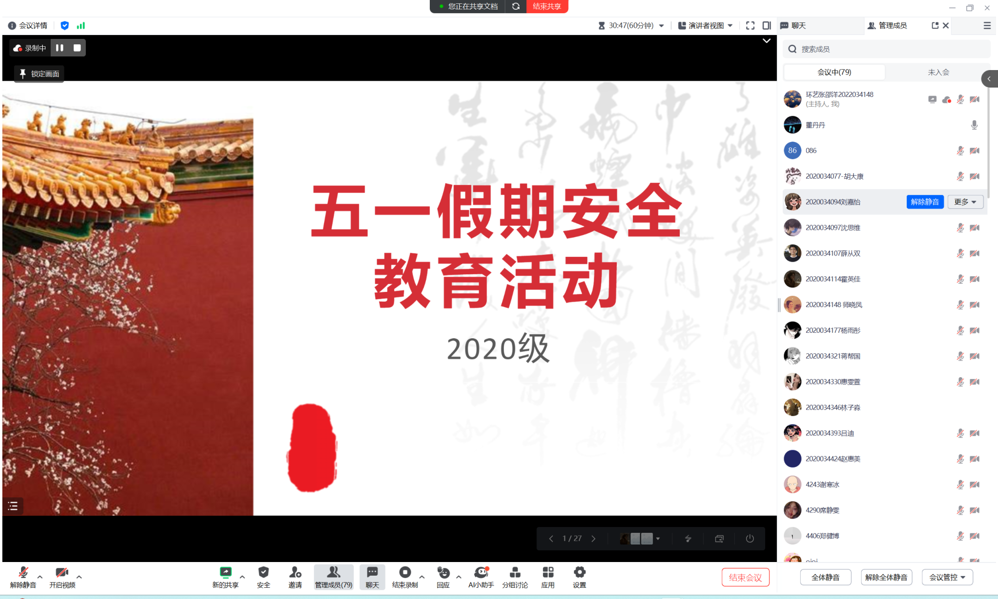 五一假期将近,为进一步增强员工的安全意识,确保平安返校。4月30日,2020级开展五一假期安全教育主题班会,会议由辅导员董丹丹主持。
