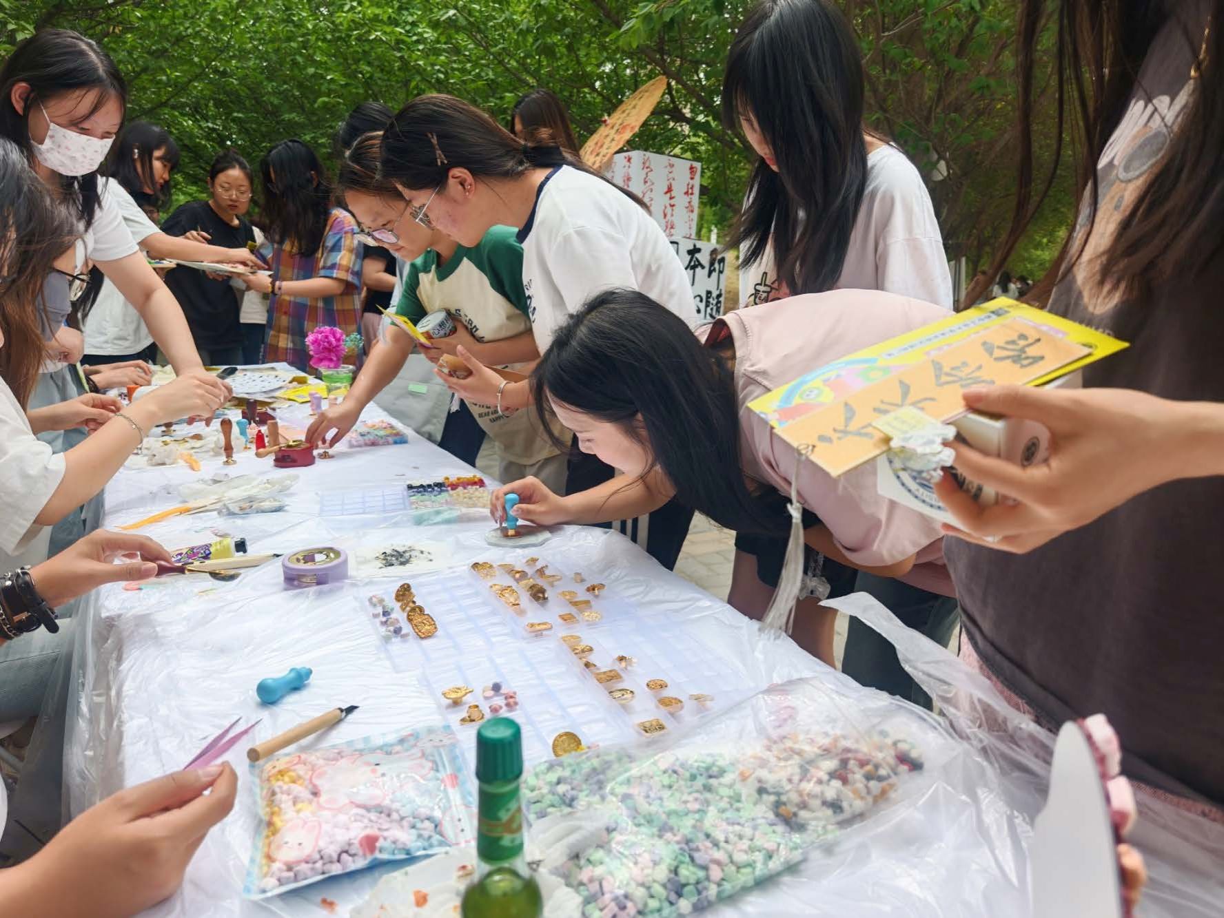 活动现场,员工负责人2022级数字媒体艺术专业万雨婷首先讲解了火漆印章的历史渊源,从东周时期用于信函密封到现代装饰艺术的演变,凸显其作为文化符号的深厚底蕴。在制作环节,参与者自由选取彩色蜡粒,加热融化后倾倒在垫纸上,用印章压印出花鸟珍禽等传统纹样。随着蜡液凝固的细微声响,一枚枚精致的火漆印章悄然成型,部分参与者还将作品制成项链或装饰信封,赋予其独特纪念意义。现场参与者表示:“活动以“慢时光”为主题,将文化传承与心理健康相结合,不仅让我们体验到手工创作的乐趣,更通过沉浸式互动缓解了日常压力,静心等待的过程仿佛时光放缓,作品完成后获得感满满。”
