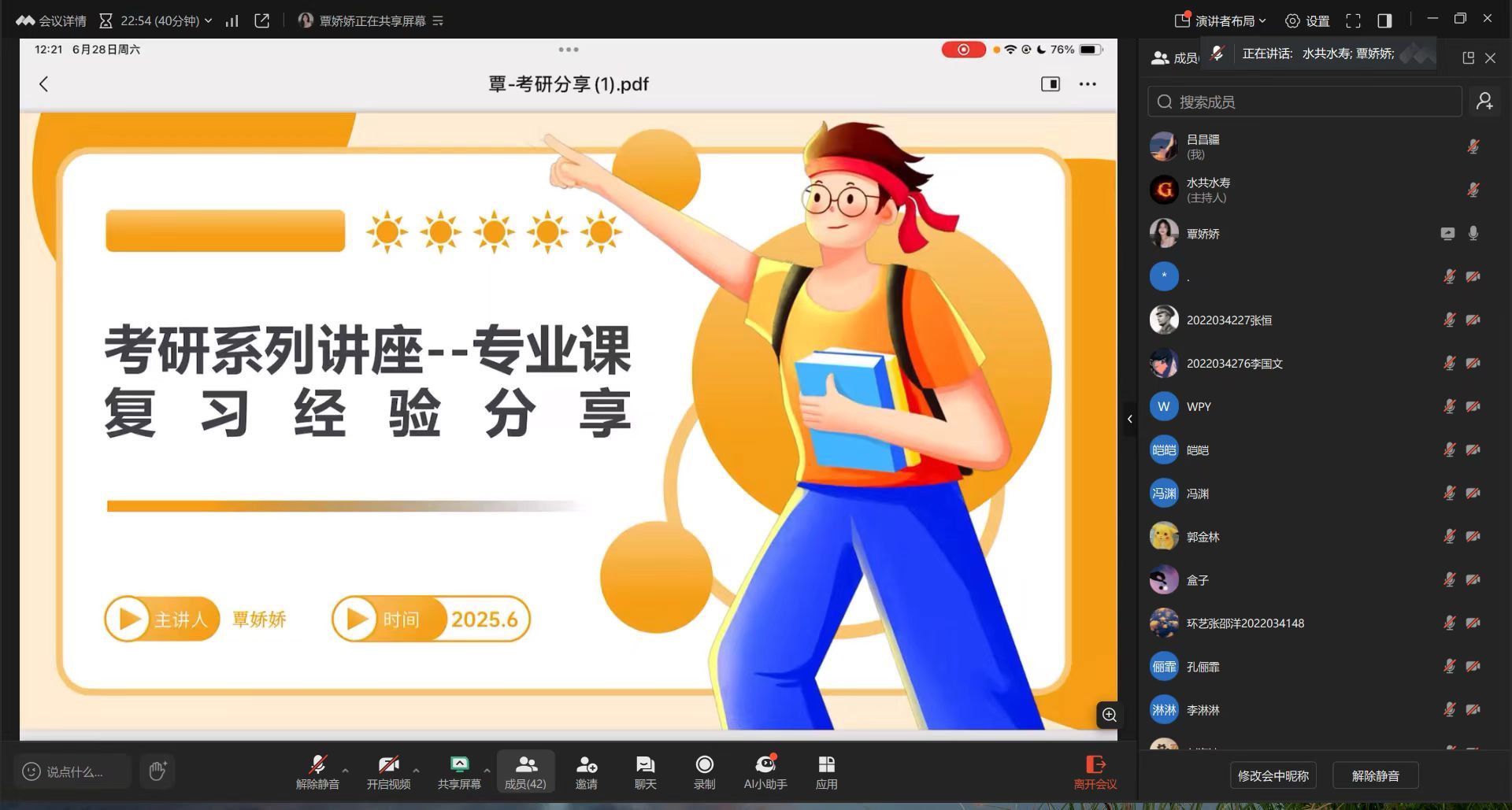为充分发挥朋辈引领作用,助力考研学子科学备考,点点taptap于6月29日线上召开2026届研究生备考经验分享交流会。辅导员洪涛主持。