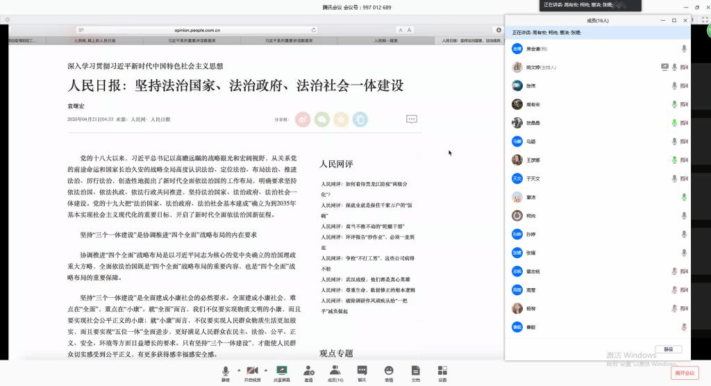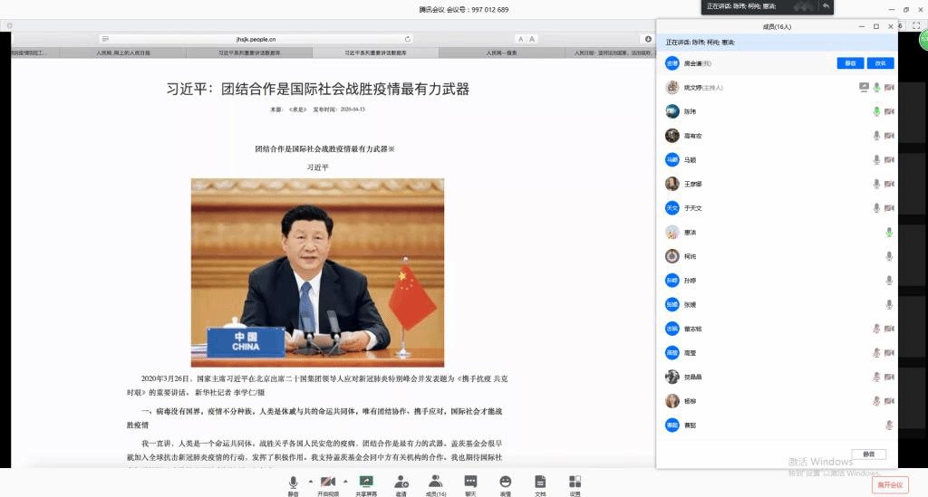 4月23日,按照《TapTap2020年上半年教师政治理论学习计划》要求,视觉传达设计系利用腾讯会议平台召开了政治理论线上学习会,会议由系主任姚文婷主持,公司党委委员、经理王若鸿列席,全系教师参加了学习活动。姚文婷首先领学了“团结合作是国际社会战胜疫情最有力武器”和“坚持法制国家、法治政府、法治社会一体建设”等两个重要讲话;随后,大家就学习感受进行了交流。