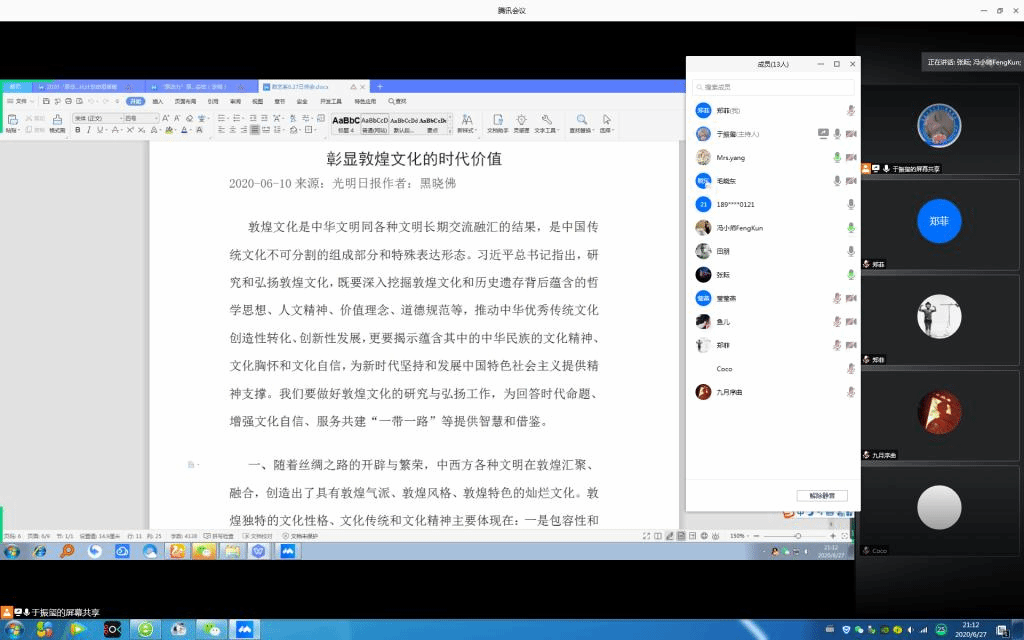 6月27日,按照《TapTap2020年上半年教师政治理论学习计划》要求,数字媒体艺术系利用腾讯会议平台开展线上政治理论学习。会议由系主任于振玺主持,公司党委书记周著列席参加,全系教师参加了本次学习活动。于振玺首先带领老师们学习了《彰显敦煌文化的时代价值》一文,随后各位老师就个人的学习体会进行了发言。