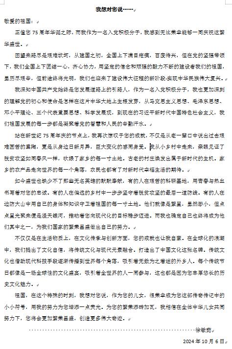 为深入贯彻党的二十大和二十届三中全会精神,热烈庆祝建国七十五周年,增强同学们的民族自豪感,公司于9月19日-10月9日组织开展了“我心中的祖国”主题实践活动,活动由公司组织员张秀丽组织。