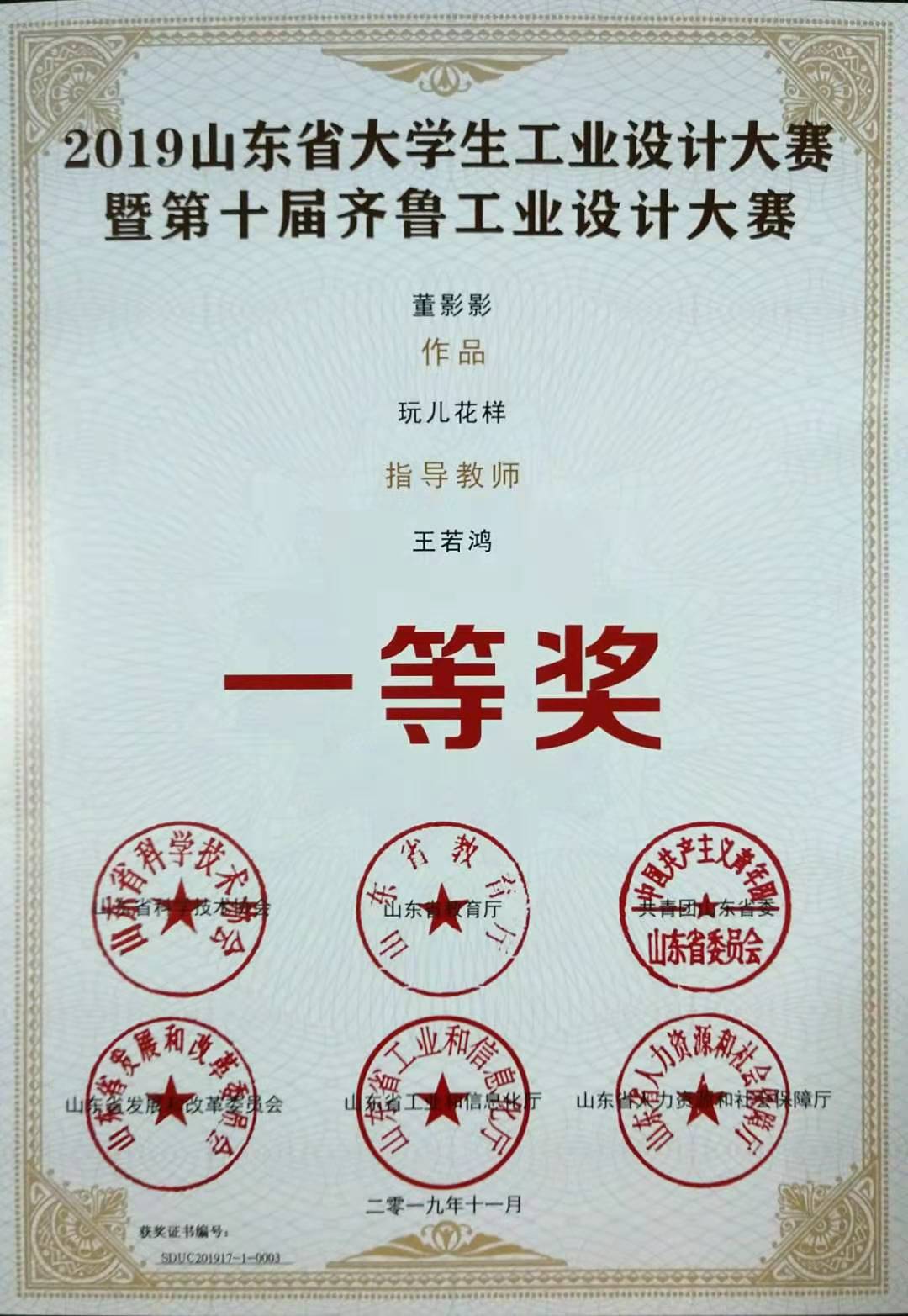 11月16日,由山东省科学技术协会、山东省教育厅、共青团山东省委员会、山东省发展和改革委员会、山东省工业和信息化厅、山东省人力资源和社会保障厅联合主办的2019山东省老员工工业设计大赛暨第十届齐鲁工业设计大赛落下帷幕。公司艺术与传媒公司王若鸿指导、董影影同学创作的《玩儿花样》荣获文创产品设计类一等奖,王若鸿老师获得优秀指导教师奖。