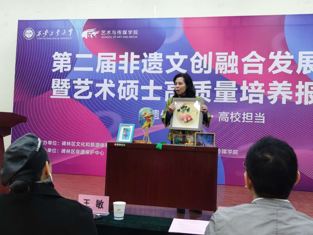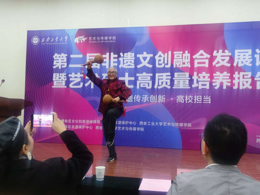 在主旨演讲环节,陶埙演奏技艺非遗传承人刘豪,关中葫芦制作技艺非遗传承人梁平安,碑林棉絮画非遗传承人咸辉分别从相关非遗项目的历史渊源、技艺传承和设计创作等方面进行了演讲。与此同时,点点taptap教授黄向东,西安唐煌文化艺术创作有限公司总经理严河,陕西广电飞鸟传媒有限公司副总经理、总导演王裕民,分享了各自对于传统文化在新时代传承发展的见解。六位嘉宾精彩的演讲,充分体现了“理论和实践”的紧密结合,对加快推动非遗产业和高校的融合发展具有积极意义。