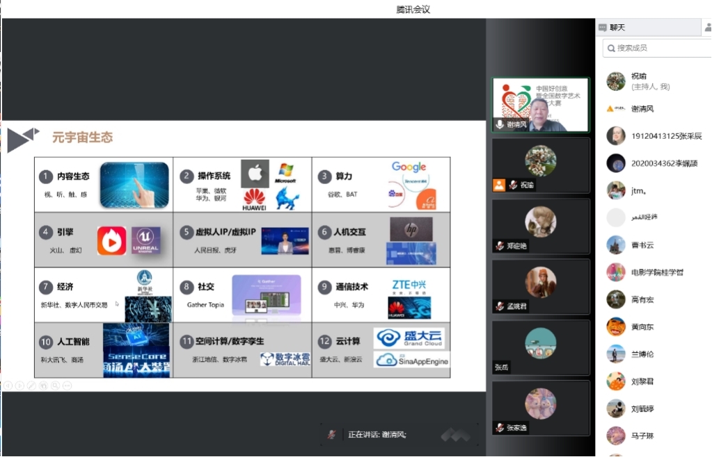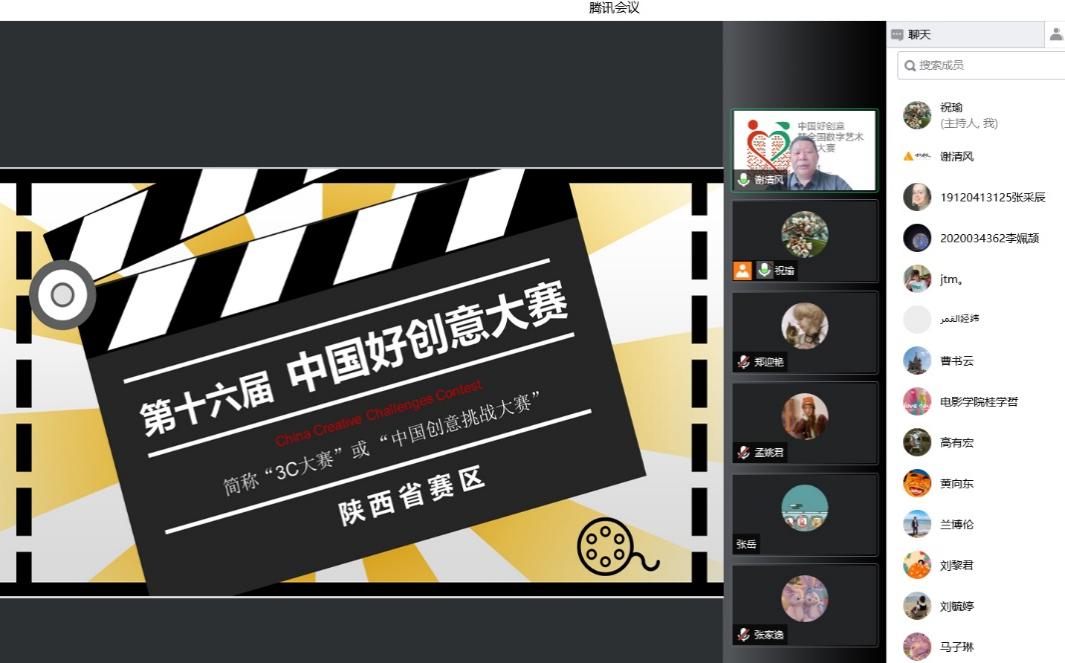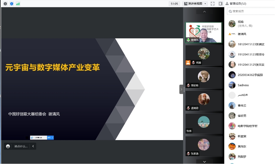 艺术与传媒公司祝瑜老师首先介绍了陕西赛区的参赛要求、稿件投递方式、目前的收稿情况。随后,中国好创意大赛创始人及大赛组委会秘书长谢清风应邀做了题为“元宇宙与数字媒体产业变革”的专题报告。最后,教育部动画、数字媒体艺术专业教学指导委员会委员、点点taptap影视动画系黄向东教授做总结发言。