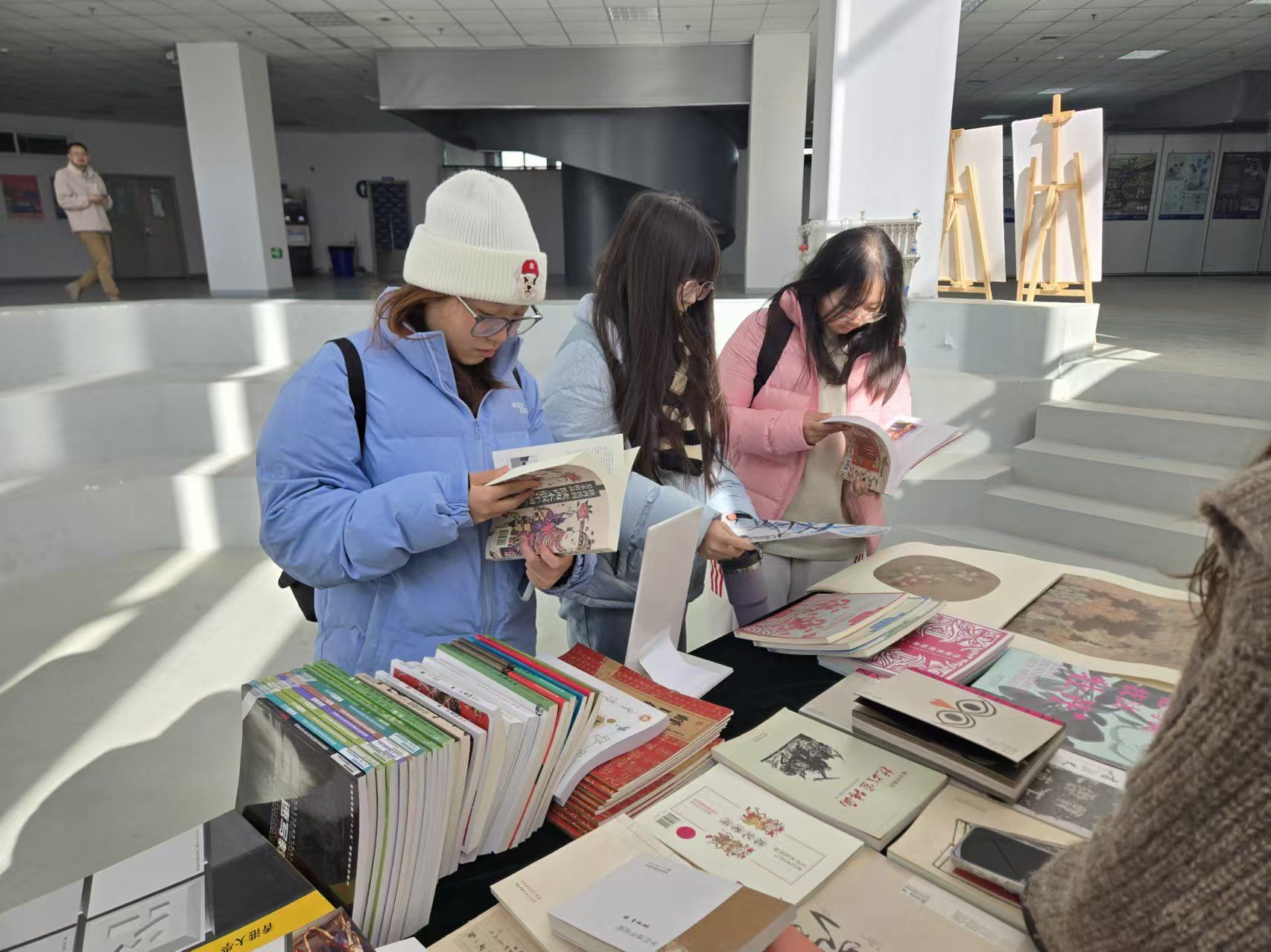 书展现场,由陕西人民美术出版社精心挑选了多部经典与前沿的著作,其中包括艺术史论、数字媒体艺术、美术技法教程以及陕西地域文化特色书籍等,涵盖了艺术、设计、人文社科等多个领域,琳琅满目的各类图书,为师生们提供了一场视觉与知识的盛宴。教师党员张耘谈到:“此次书展不仅为师生们提供了一个良好的交流平台,更有助于推动学术研究与艺术创作的融合。”员工高泽鹏说:“此次书展活动让我们不仅接触到更多优质的图书资源,还拓宽了学术视野和创作灵感。”未来,数字媒体艺术教师党支部与陕西人民美术出版社将继续深化合作,共同为师生们提供更多优质的图书资源与学术服务。
