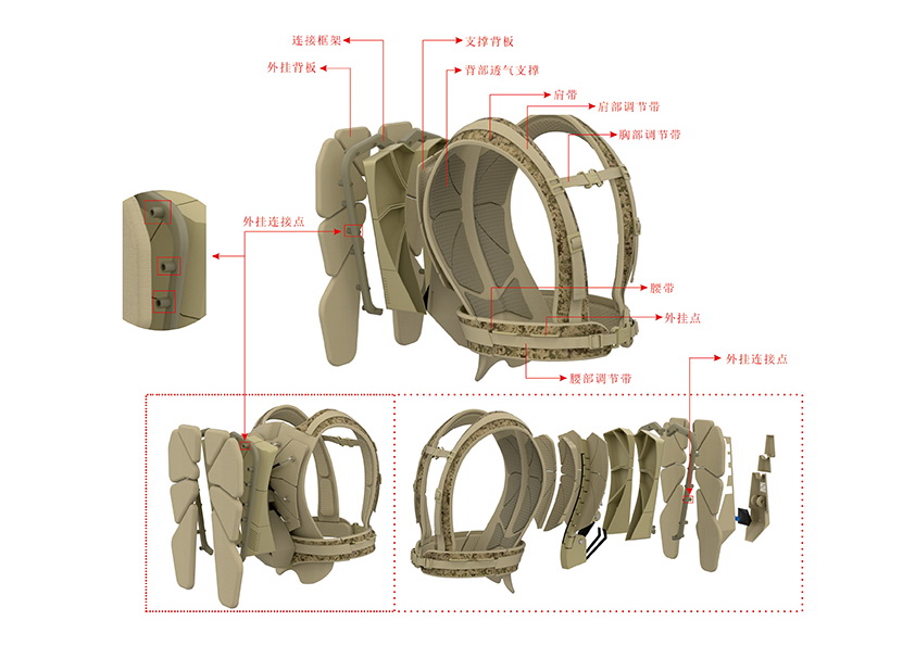 本文分别从军用背包背负和存储两个系统提炼主要的需求目标,并寻找能够与之形成相似性的生物特性。背负系统:主支撑骨架和部分辅助支撑的结合将参照蛇亚目的脊柱与肋骨,以及肌肉之间的结构体系来进行完善;存储系统:主要借鉴蛇头部和腹部鳞片分布进行功能的分配和造型提取,实践中背负系统将外架包与内架包的特点相融合,采用框架形式结合,外架框避免了背部与背包的直接接触,通风性和稳定性更佳;在贴近人体背部的部位,背负与腰带、肩带采用“S”形的设计,既可调整重心也可合理分负重力;这种外挂式的背负系统可以实现一种背负系统搭配不同的作战模块,满足不同的作战单元和需求,这种设计理念更符合课题提出的模块化存储的需求。