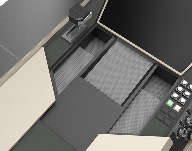 某型号军用特种车辆驾驶室方案系列二为概念设计,在军用特种车辆驾驶室可用性设计原则下,对驾驶室的中央控制台、机舱、操控设备及整体布局进行优化设计。该方案将操作设备与电子设备整合在仪表台与机舱内,并设有可伸缩式武器控制面板,为乘员提供更大的工作空间,提升乘员的操作舒适度。右侧设有盲区辅助显示器,配合车外摄像头可为驾驶员提供更丰富的车辆与路况信息。在武器控制模块部分的设计中,将传统的操控模块转化为贯通式触摸屏幕,加大乘员对战场信息的获取,并提供更多的交互可能性。采用整体性设计语言,将中控与机舱连为一体,在提升视觉效果的同时将设备进一步靠近乘员可达域,提升对空间的利用与操作便捷性。融入多边形设计语言,使得驾驶室整体充满科技感与未来感,增加驾驶室造型美感,有效提升乘员主观满意度。
