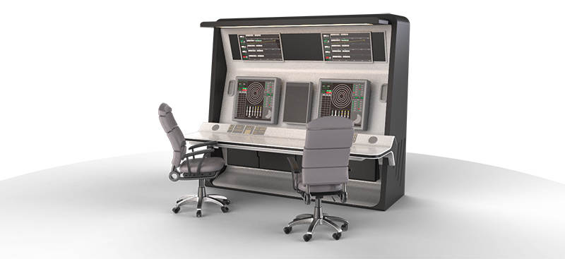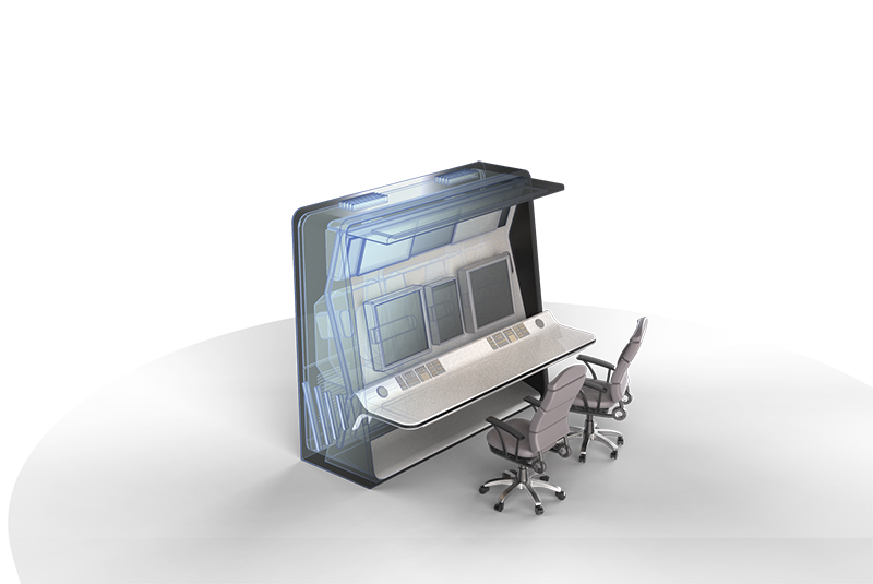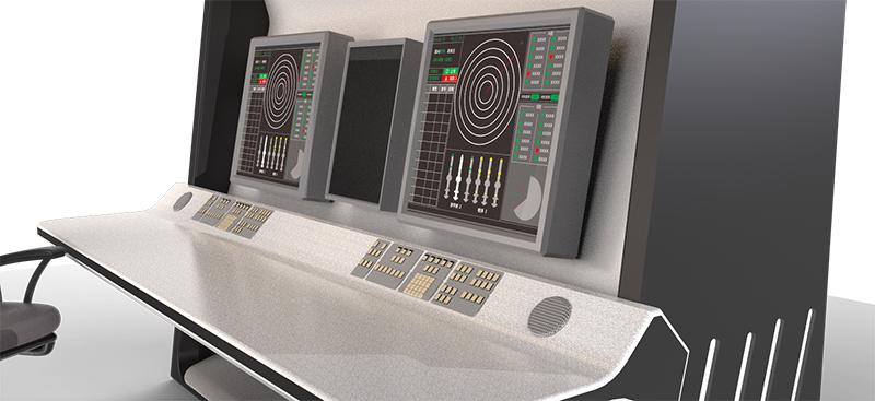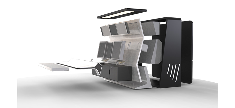 整体采用堡垒式电子雷达造型,象征着防御和进攻兼备,以防御雷达为导向,上部为可伸缩照明灯,灯光可根据环境光源改变自身的亮度,达到不反光、不刺激用户的目的,侧面增加微弱环境灯,颜色主要采用蓝色以及黑色,在稳重大方的基础上又富有现代感、科技感,彰显了空军的气质。下部采用放脚的脚踏板。配备四个主机柜,操控台侧面、顶部及后部散热,侧面增加微弱环境灯;在屏幕设计上,上屏幕采用固定式屏幕,下部3个采用可调节式屏幕,可根据用户的坐姿自动旋转更舒适的屏幕角度。内部采用模块式设计,增加了耐用性,安全性。取消了键盘,采用桌面虚拟键盘,桌面也可以根据人体坐姿有一定的升降。配备储物抽屉,抽屉中存放备用的键鼠套装。