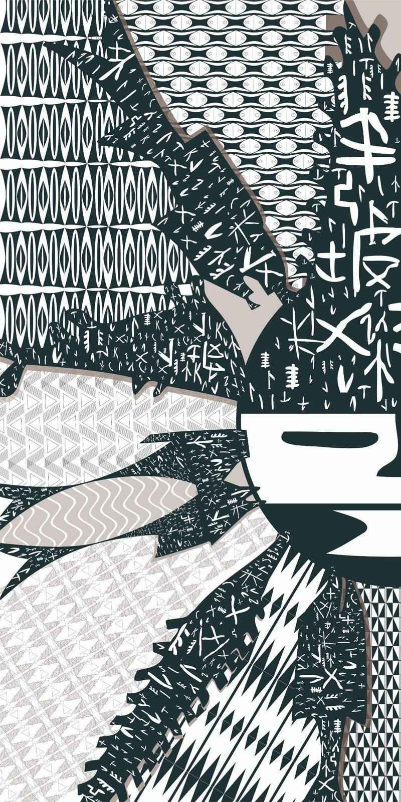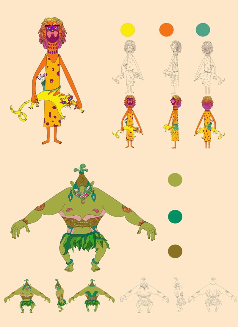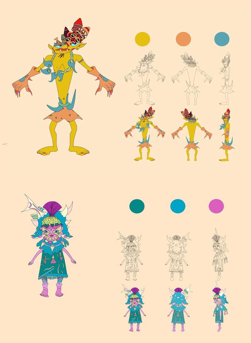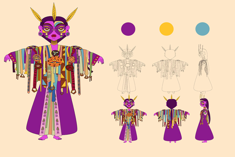 通过现代插画艺术风格进行角色、场景衍生开发设计和应用,半坡角色的衍生开发,是一种“再设计”,是对文化的重新审视、理解文化背景、融合半坡文化元素中蕴含的思想情感结合现代艺术风格,在半坡角色衍生设计一开始对于要呈现的角色形象是没有完整的概念的,很多灵感都是在草稿绘制过程中产生的,所以创作过程会不断地突破,不断地发现惊喜,改良新的角色。角色的衍生开发设计借鉴了中国传统民族文化与绘画风格,将归纳出的造型符号赋予角色。角色形象是依据原始生活中的社会分工等绘制,优化处理线条的细节,让其符合现代的审美标准,角色更加充实和有趣,具有半坡特色。半坡衍生场景以女巫为视觉中心,以水为祈福具体形式表现,连接各点组成捕鱼、祈福、狩猎、农耕等长卷绘制。根据移动媒体的流行趋势,确定画幅的长宽比以手机屏幕为主,显示比例是16:9。内容上从左往右分别是捕鱼、祈福、狩猎、农耕四个部分整体场景是一个完整首尾可拼合的整体,一方面能将整体角色更好的展现出来,另一方面传达敬畏自然与自然的和谐相处的思想观念。多样化展示了史前文化的魅力,能让更多人了解不一样的半坡文化。